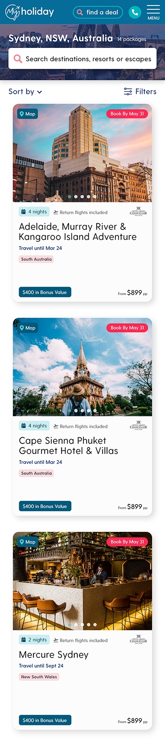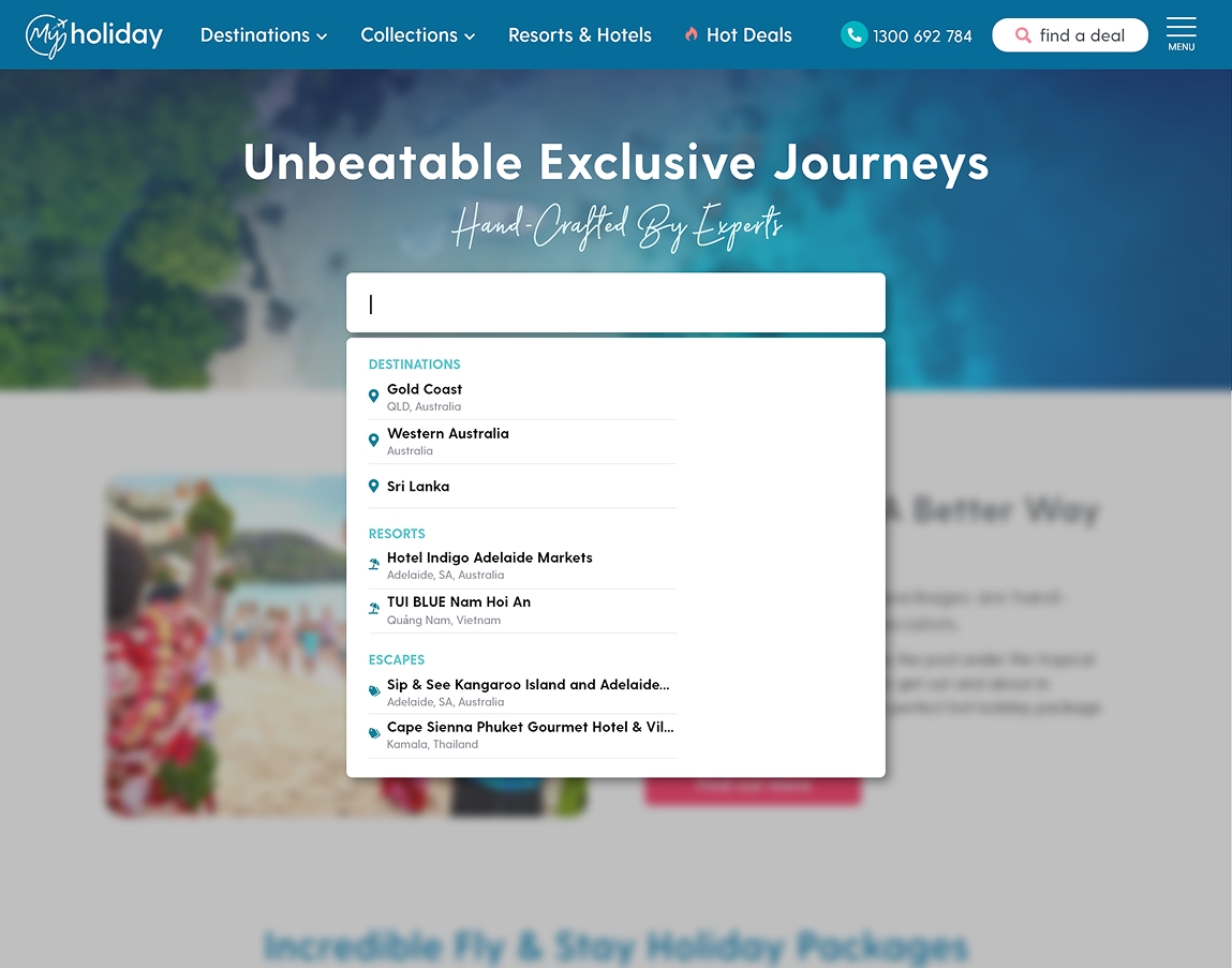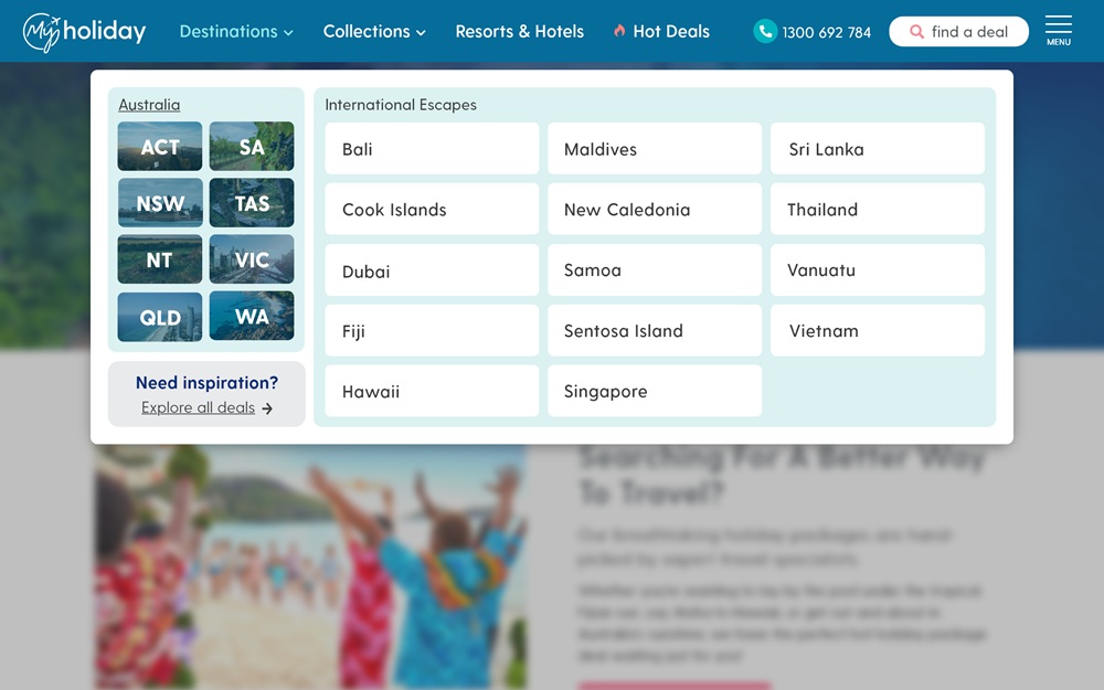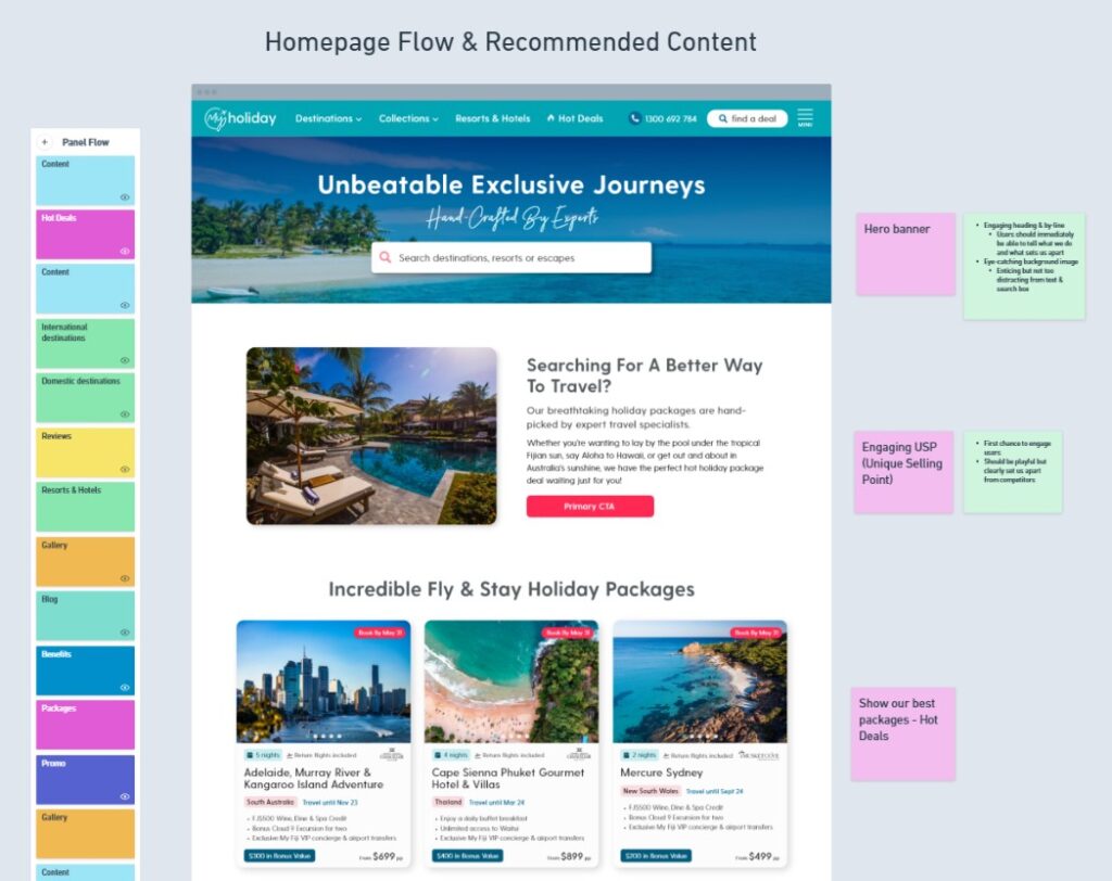 A key challenge was building a more discoverable and user-friendly navigation system. I designed a persistent top-level menu to surface key categories and reduce reliance on the previously hidden mega-menu. Alongside this, I introduced a new package search tool to support users looking for specific destinations or inclusions. These changes were prototyped, tested, and refined based on feedback from both stakeholders and behavioural tracking data.