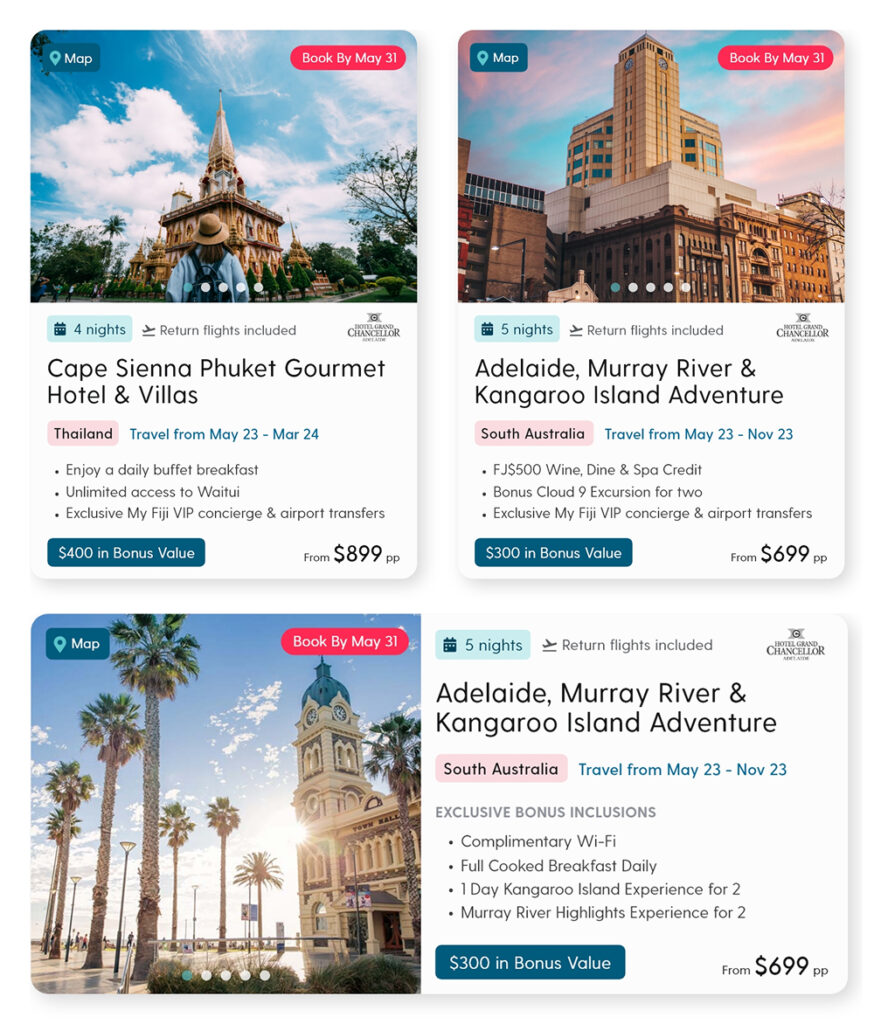 The original package cards were oversized, visually repetitive, and difficult to compare. I redesigned the card layout to make critical information – such as price, inclusions, and CTAs – easier to scan. I also introduced consistent formatting across the shop page to support browsing and comparison behaviours, particularly on mobile.