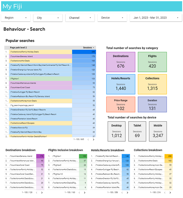Image: Analysis of search behaviour on modular site, using Google DataStudio to create an interactive report. This was helped prioritise menu and search structure.