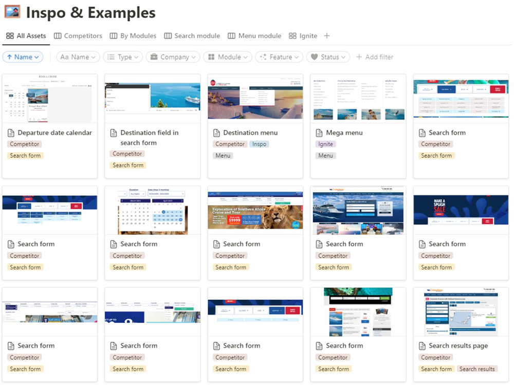 Image: Collection of screenshots from competitor websites, showcasing various features for inspiration. Organised on Notion.