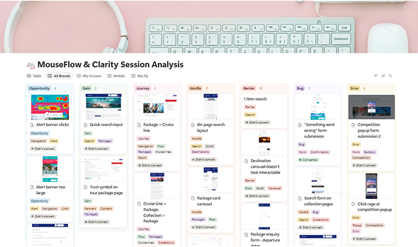 Image: User behaviour observations from MouseFlow and Microsoft Clarity (user tracking software) organised on Notion.